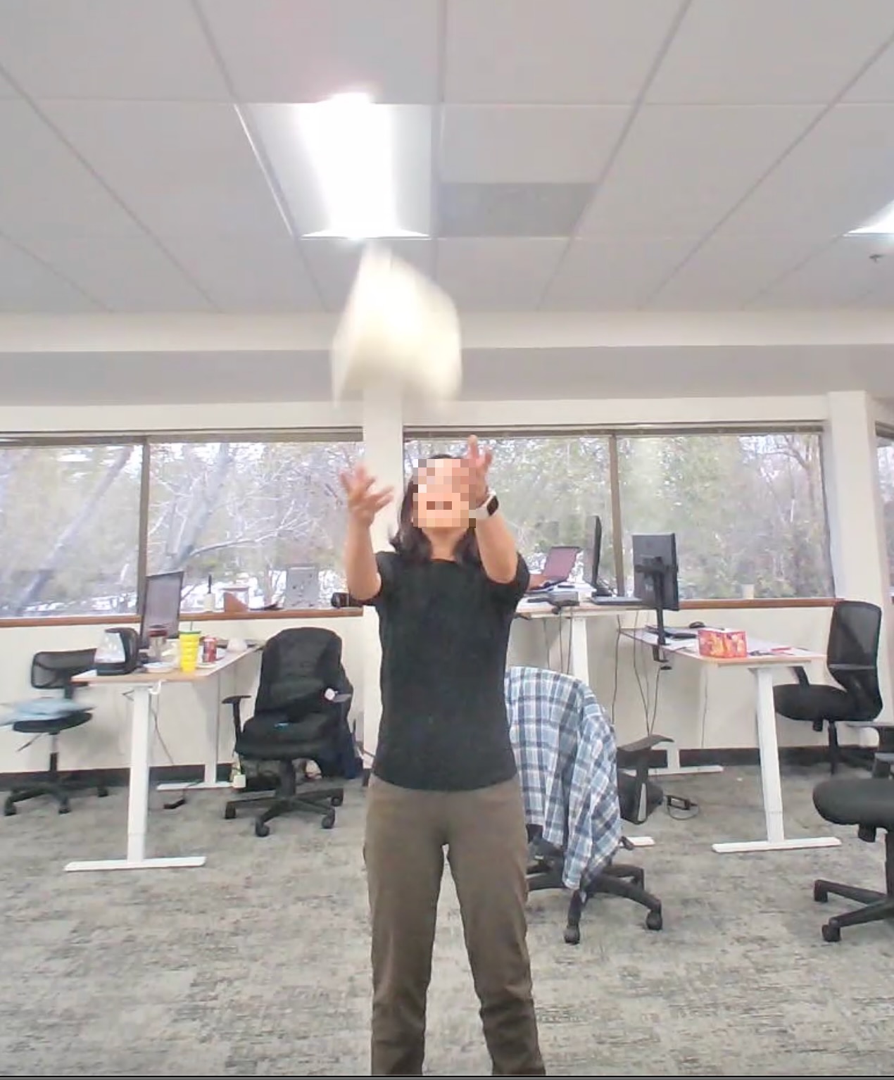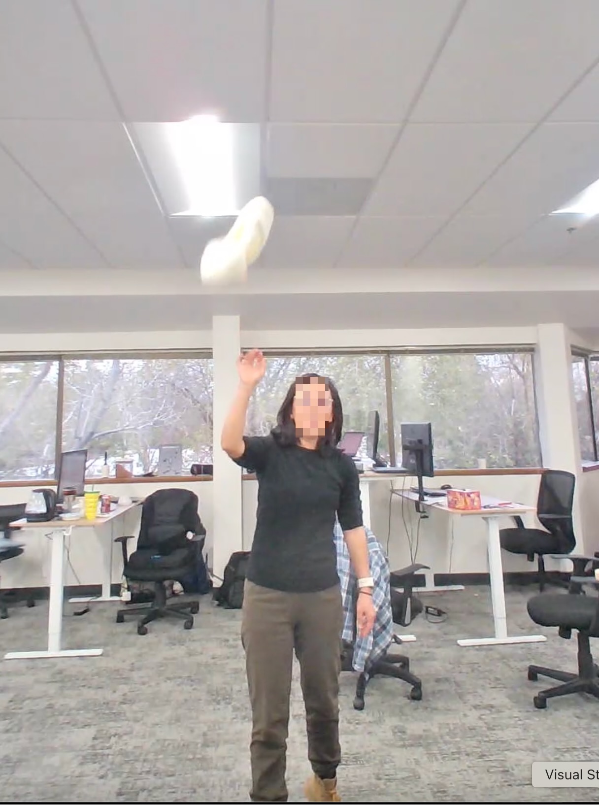 **Side throw away:** | Model | Output | |-------|--------| | Cosmos-Reason2-8B | "The hat lands on the desk near the person working at the computer. It is getting further away from you. There is no danger for the hat to hit you." | | Qwen3-VL-8B-Instruct | "The hat is getting closer to you. It is falling downward and will likely land near your head or shoulders. There is a potential danger for the hat to hit you, so you should move your head away or duck to avoid it." | **Spin + throw toward:** | Model | Output | |-------|--------| | Cosmos-Reason2-8B | "The hat will land at the center of the frame, near the person. The hat is getting closer to me. Yes, there is a danger for the hat to hit me." | | Qwen3-VL-8B-Instruct | "The hat is currently being tossed upward and will land on the floor in front of you, slightly to your left. It is getting closer to you as it descends, and there is a low risk of it hitting you since it will land on the floor before reaching you." | **Lateral throw:** | Model | Output | |-------|--------| | Cosmos-Reason2-8B | "The hat is moving upward and to the left, away from your position. It is getting further away from you, and there is no immediate danger of it hitting you." | | Qwen3-VL-8B-Instruct | "The hat is currently in mid-air, moving upward and slightly forward from the woman's hand. Based on its trajectory, it will likely descend toward the floor or a nearby surface, not directly toward you. It is getting closer to the ceiling and then will begin to fall downward, so relative to your position, it is moving away from you as it ascends, then closer as it descends—but not in a direct path toward you. There is no immediate danger of the hat hitting you..." | **Toss upward:** | Model | Output | |-------|--------| | Cosmos-Reason2-8B | "The hat will land at the center of the frame, closer to the camera. It is moving closer to you, and there is a potential risk of it hitting you." | | Qwen3-VL-8B-Instruct | "The hat is currently being thrown upward and is moving away from you as it ascends. It will reach a peak and then begin to descend back toward the ground. Since it's moving away from you at the moment, it is not getting closer. There is no immediate danger of the hat hitting you..." |Interpretation: