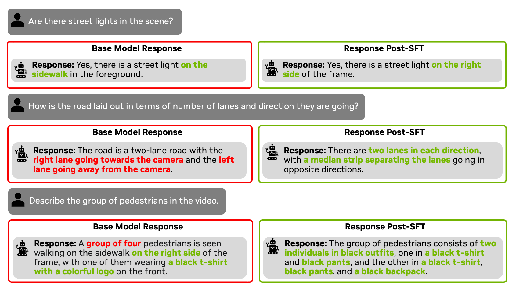 Supervised Fine-Tuning (SFT) is used to improve the accuracy of a pre-trained model by teaching it to follow specific instructions or understand new tasks using labeled examples. While a base model learns general patterns from large, diverse data, SFT aligns the model to specific tasks with desired outputs by showing clear input–output pairs. Using domain-specific data is essential—it embeds the specialized vocabulary, visual patterns, and reasoning needed for real-world scenarios. In this recipe, we show how to fine-tune the Cosmos Reason 2-8B model to understand the world from a traffic point of view - scene understanding, road attributes, and pedestrian situation.