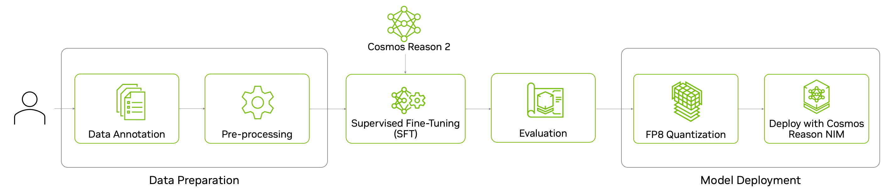Here’s the end-to-end workflow to fine-tune Cosmos Reason 2 - from data preparation, to training and evaluating the model, and finally quantizing and deploying the model for inference.