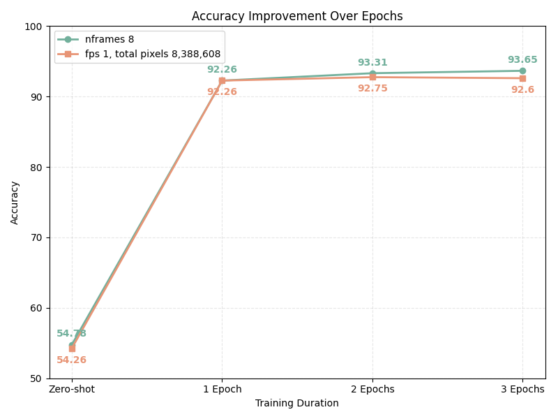- Optimal training settings depend on the task: More vision tokens in post-training do not always guarantee better results. In our case, using 3k vision tokens (with higher resolution per frame) yielded greater accuracy in about one-third the training time compared to using 8k vision tokens (with more frames sampled).